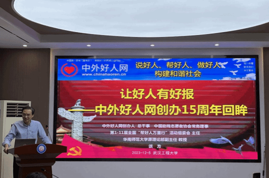 (通讯员:熊雪璟 张悦)12月5日晚,中外好人网武汉办事处授牌聘任仪式暨大型思政选修课《加油中国》第五季第七讲在beat365官网中文版本求是楼112报告厅举行。“中外好人网”创办人、华南师范大学谈方教授受邀主讲,以“让好人有好报—中外好人网创办15周年回眸”为主题,从什么是“中外好人网”、为什么要创办中外好人网以及中外好人网15年的发展历程和成绩三个方面为大家做了详细阐释,本次活动由beat365官网中文版本副经理常城教授主持。