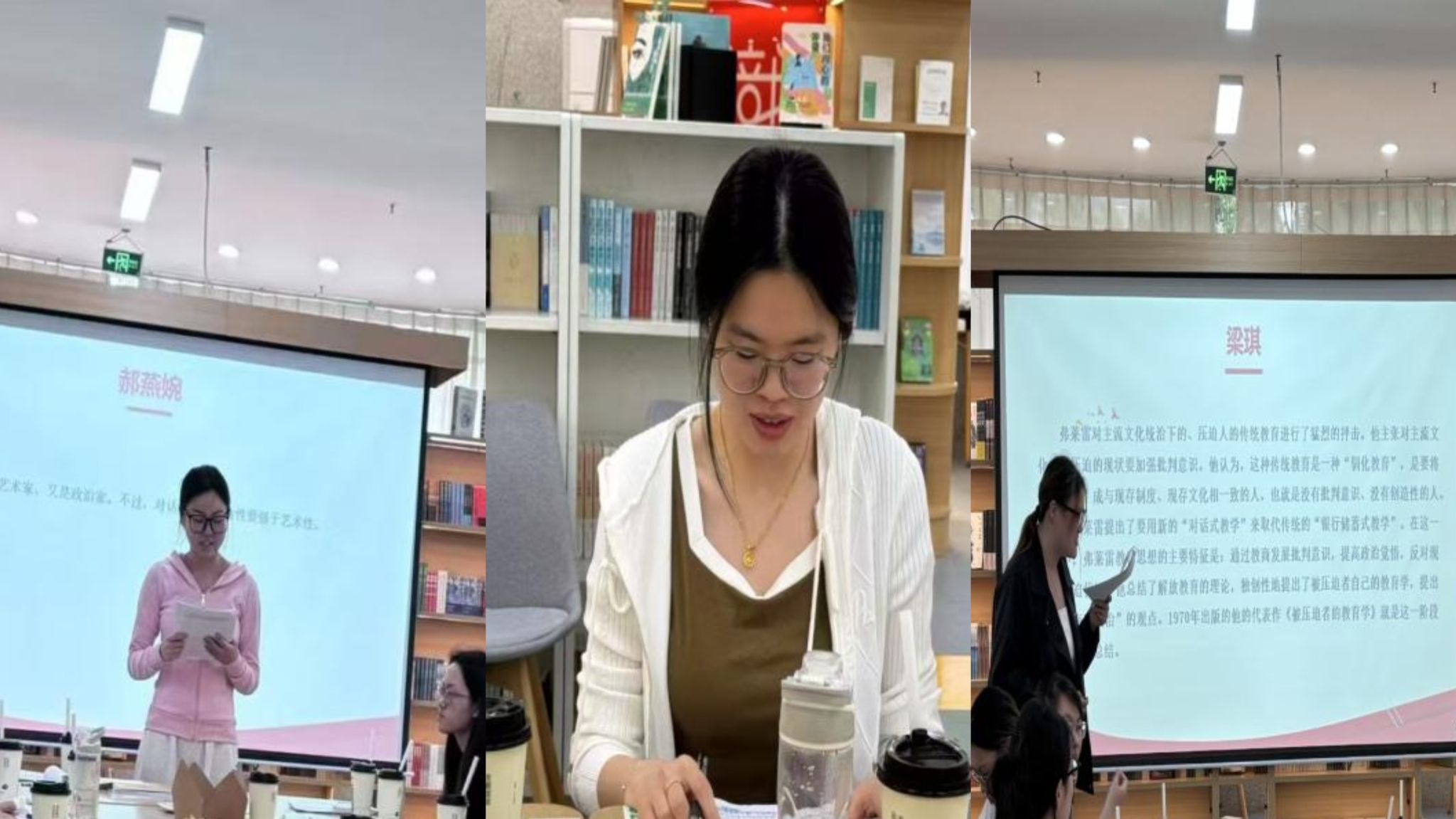 张悦悦主要倡导弗莱雷教育理念,反对学科内容以晦涩术语、空洞理论或孤立事实呈现,主张依据员工经验、用员工语言将内容作为问题提出,让学习内容与生活思想融合。刘欣引用《被压迫者的教育学》指出,解放不是一个人能单独完成的事。没有人能单方面拯救他人,也无法仅靠自己实现解放,真正的自由需要大家一起行动,通过改变现实来共同获得。只有当人们团结起来,在行动中不断反思和调整,才能打破压迫的循环。张艺璇通过引用《被压迫者的教育学》中的核心观点,强调解放的本质是通过行动与反思的实践实现人性化。指出教育应成为揭露现实矛盾、推动社会正义的工具,师生需以平等身份共同探索问题,在行动中检验反思成果,最终打破压迫循环,重建人性尊严。