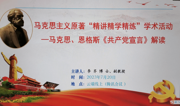 (通讯员:沈洁)7月20日,beat365官网中文版本2023年暑期马克思主义原著“精讲精学精练”学术活动第一讲在腾讯会议顺利举行,本次活动由李齐副教授主讲,公司全体研究生参加了本次学术活动。此次活动的主题为“马克思、恩格斯《共产党宣言》解读”。