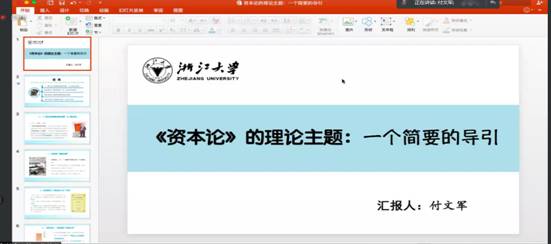 本次读书会主题为“<资本论>的理论主题:一个简要的导引”,阅读书目为《资本论》、《马克思恩格斯文集》等马克思主义主要著作。付文军副教授在正式解读《资本论》之前,阐明了在研究《资本论》时会遇到的相关学术问题,例如学科交叉比较众多、著作内容繁多、理解难度大、出科研成果不易等。