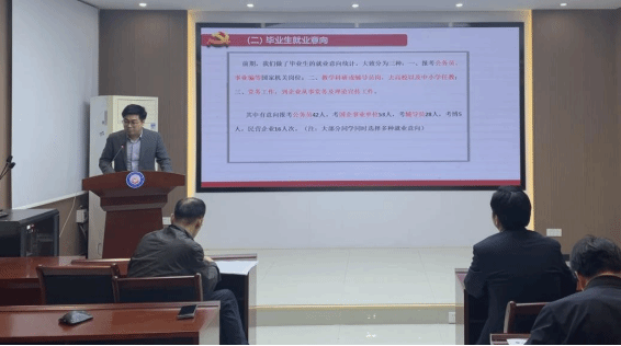 公司研究生工作办公室主任蔡明广首先汇报了公司毕业生的基本信息及就业去向。2024届的87名应届毕业生的就业意向主要分为三类:一是报考公务员或事业单位;二是进入教育或科研领域,包括思政课教师和辅导员职位;三是参与企业党务及理论宣传工作。蔡明广还详细分析了当前高校的就业形势和目前毕业生的就业情况,并从就业工作的目标、策略、加强就业教育和队伍建设等方面进行了详细汇报。