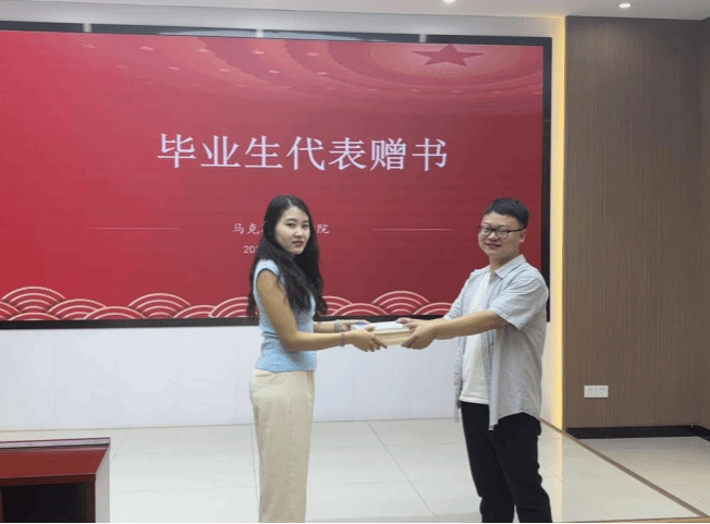 随后,赠书仪式上,优秀毕业生丁薇学姐向2022级员工代表进行赠书,并向学弟学妹们送上自己最真挚的祝福。