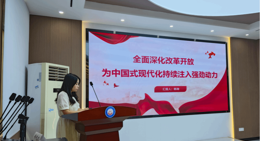 韩琳同志讲授微党《全面深化改革开放,为中国式现代化持续注入强劲动力》。她分享习近平总书记的重要论述,推进中国式现代化,必须进一步全面深化改革开放,不断解放和发展社会生产力、解放和增强社会活力。要坚持目标导向、问题导向、结果导向,准确识变、科学应变、主动求变,以坚如磐石的定力和不畏艰险的勇气,锐意进取、攻坚克难,才能不断谱写中国式现代化新篇章。