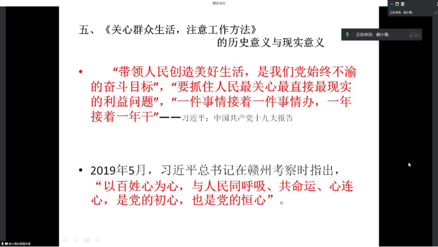 接着,熊小青教授介绍了《关心群众生活、注意工作方法》的历史背景。他指出《关心群众生活、注意工作方法》的诞生一方面离不开毛泽东同志对于“反围剿”时期革命根据地出现的军事、经济、生活以及革命工作方面问题的思考,同时也是毛泽东同志结合自身调查研究所得出的理论成果。熊教授结合原著文本内容,对《关心群众生活、注意工作方法》的主要内容进行了深入而细致的解读,逐一向同学们解析、回答了“为什么要关心群众生活”、“怎么关心群众生活”、“为什么要改进工作方法”以及“关心群众生活、改进工作方法的积极意义”这四大问题。熊教授基于文本内容的详细解读使同学们对《关心群众生活、注意工作方法》的文本内容、主旨思想以及理论价值有了全面且深入的认识与了解。