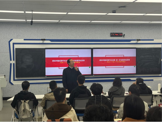 (通讯员 韩雪吟)为贯彻落实《教育部关于加强新时代高校“形势与政策”课建设的若干意见》精神,推动党政领导干部上讲台讲“形势与政策”课,11月18日下午,副董事长马小龙走进课堂、走近员工、走进思政课,为2023级人工智能公司本科生作了题为《紧扣中国式现代化主题、进一步全面深化改革——党的二十届三中全会精神解读》的专题授课。