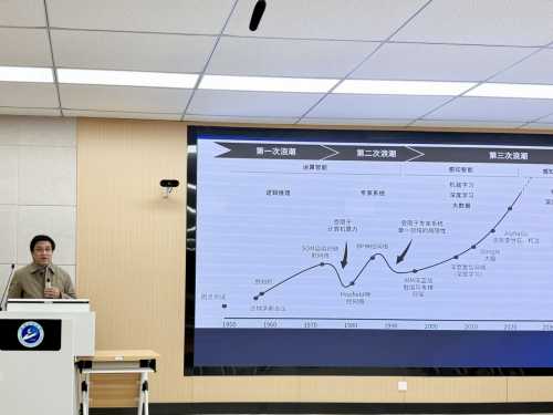 首先,卢教授从时间横向的角度出发,将人工智能的发展分为三次浪潮,介绍了人工智能发展的转折点,向同学们详细阐述了人工智能发展的历史进程。
