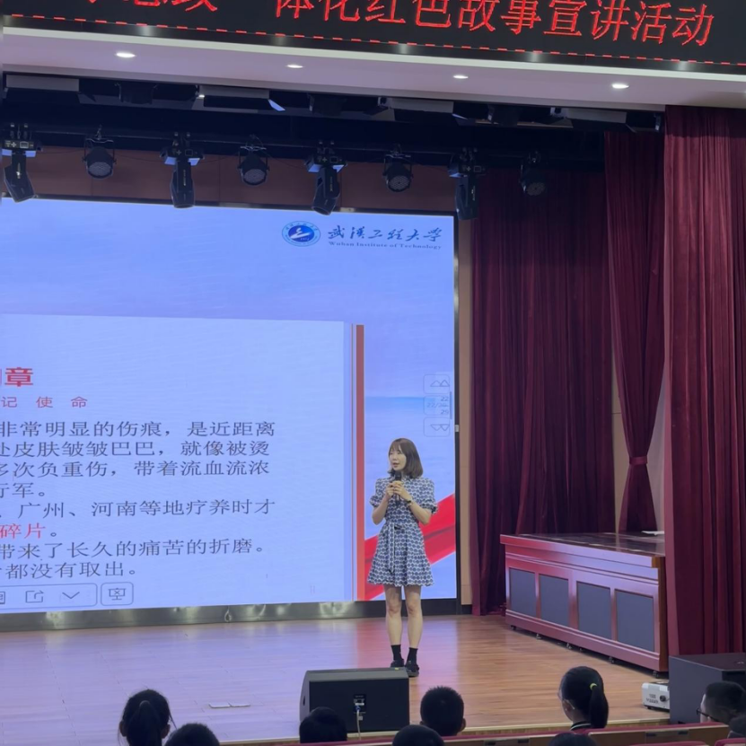 首先,崔晋文老师以“第一代”宣讲人的身份登台,凭借其深厚的理论素养和生动形象的讲述方式,向武大一附小的孩子们娓娓道来她爷爷崔洪祥烈士的革命事迹。她巧妙地以“种地”“记事本”“坦克”三张图片为切入点,将红色记忆转化为孩子们易于感知的“身边事”,使原本抽象的精神变得鲜活可触。孩子们全神贯注地聆听,眼神中闪烁着对红色故事的好奇与敬仰,仿佛穿越时空,亲身感受那段峥嵘岁月。