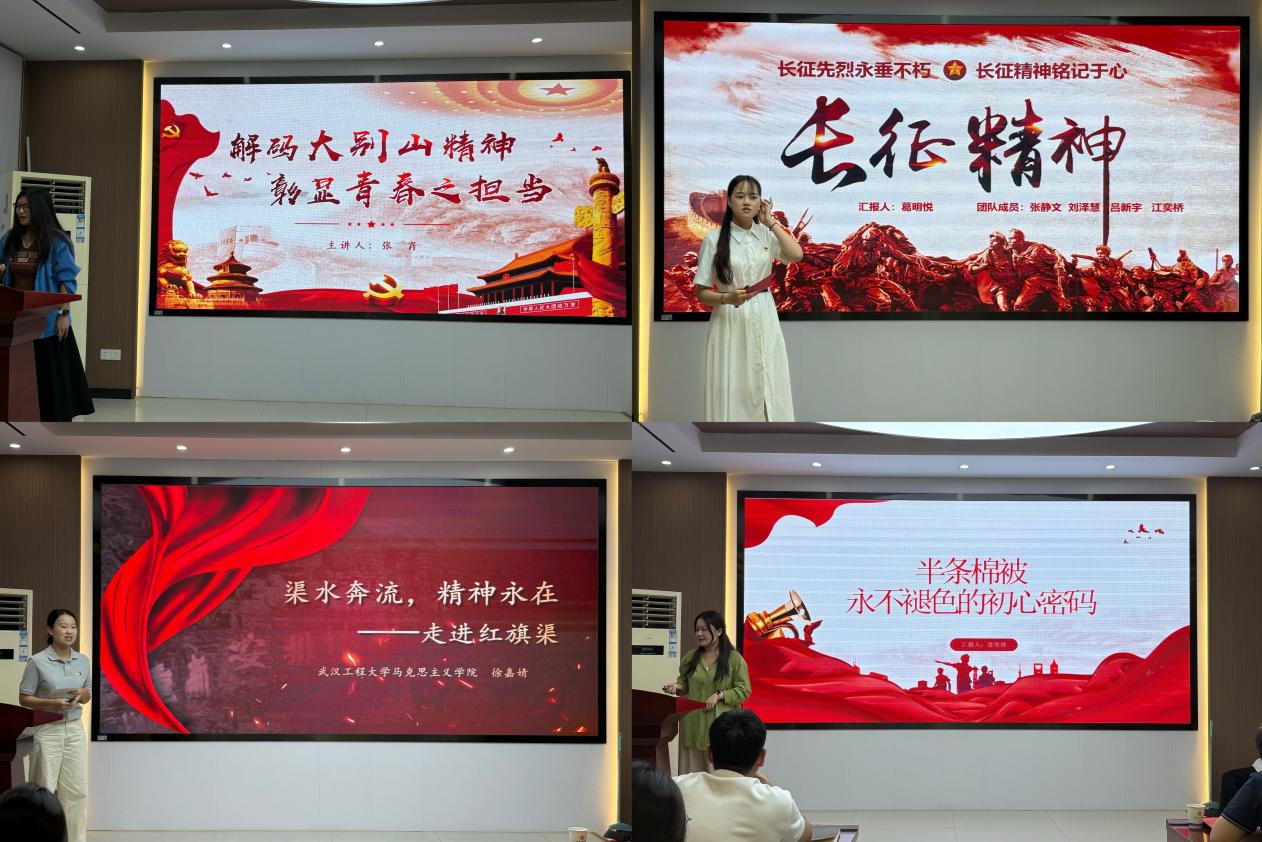 张肖团队阐述了大别山精神的丰富内涵,强调其是共产党人和人民群众在革命斗争中铸就的宝贵精神财富。葛明悦的微党课围绕长征展开,号召马院员工讲好长征故事。徐嘉婧讲述了红旗渠修建的背景、过程、成功原因及精神内涵,激励当代青年传承这些品质。查雪琪主要陈述了“半条棉被”的故事,激励新时代党员干部在各方面践行初心使命,继续奋斗。