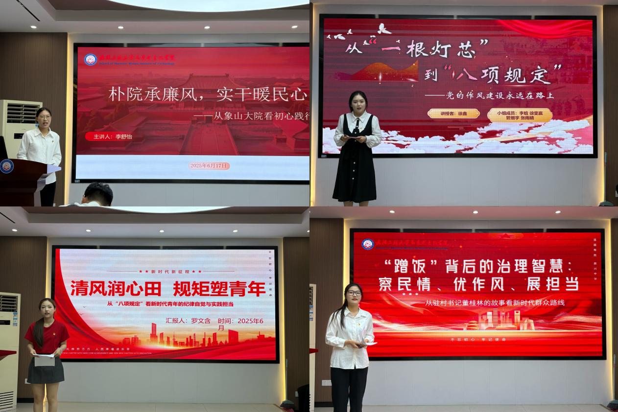 通过讲述浙江象山县政府大院的简朴外观,李舒怡展现了其艰苦奋斗、实干兴邦的精神风貌。徐鑫讲述了从井冈山时期 “一根灯芯” 的艰苦奋斗到新时代 “八项规定”,强调作风建设永远在路上。罗文含讲解了中央八项规定精神,强调新时代青年要践行中央八项规定精神,强化纪律自觉与责任担当。常晓莹通过讲述河南驻村书记董桂林“蹭饭”的故事,强调新时代基层干部应践行群众路线。