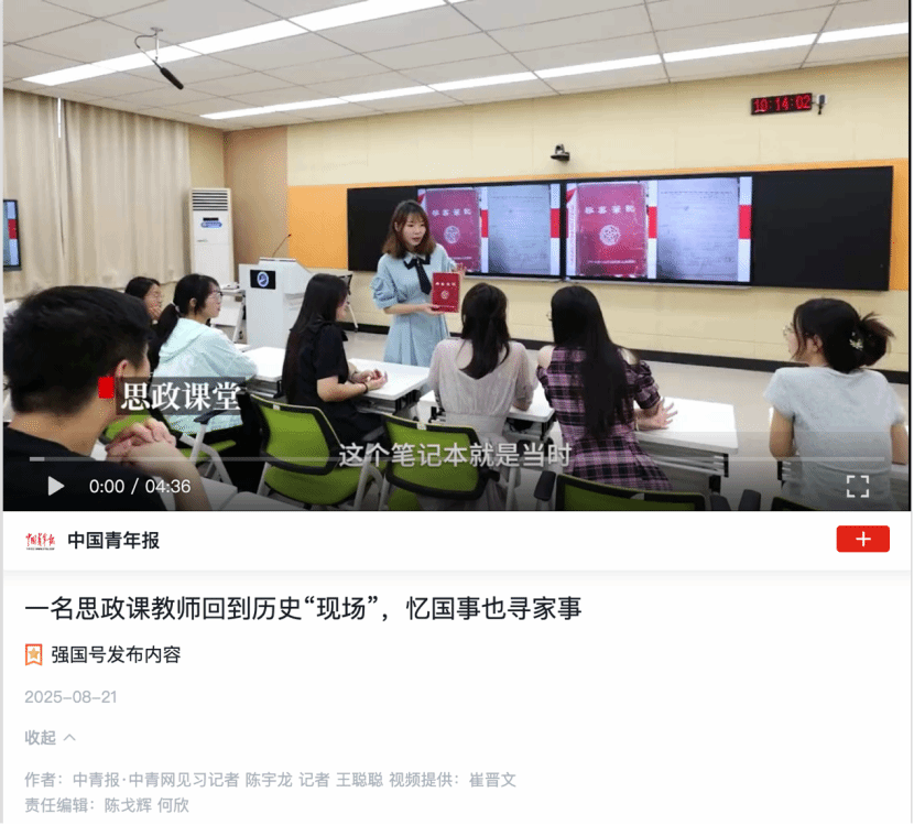 宏大叙事如何与青春困惑对接是当下思政课教师面临的共性挑战。崔晋文作为一名一线思政课教师,一直在思索这个问题:如何缩短员工的距离感?如何真正让讲课内容“入脑入心”? 看到鲜活的历史在年轻一代眼中日渐模糊,甚至被娱乐消解,这深深触动了崔晋文。在2021年中国共产党成立100周年的时候,她开始将爷爷尘封的遗物:那些笔记本、勋章、老照片等带到课堂。崔晋文希望,历史不再是教科书上冰冷的铅字,而是可触摸、可共鸣的真实存在。