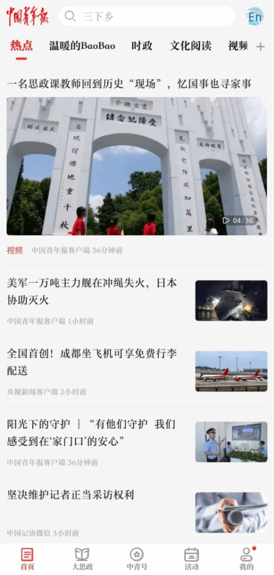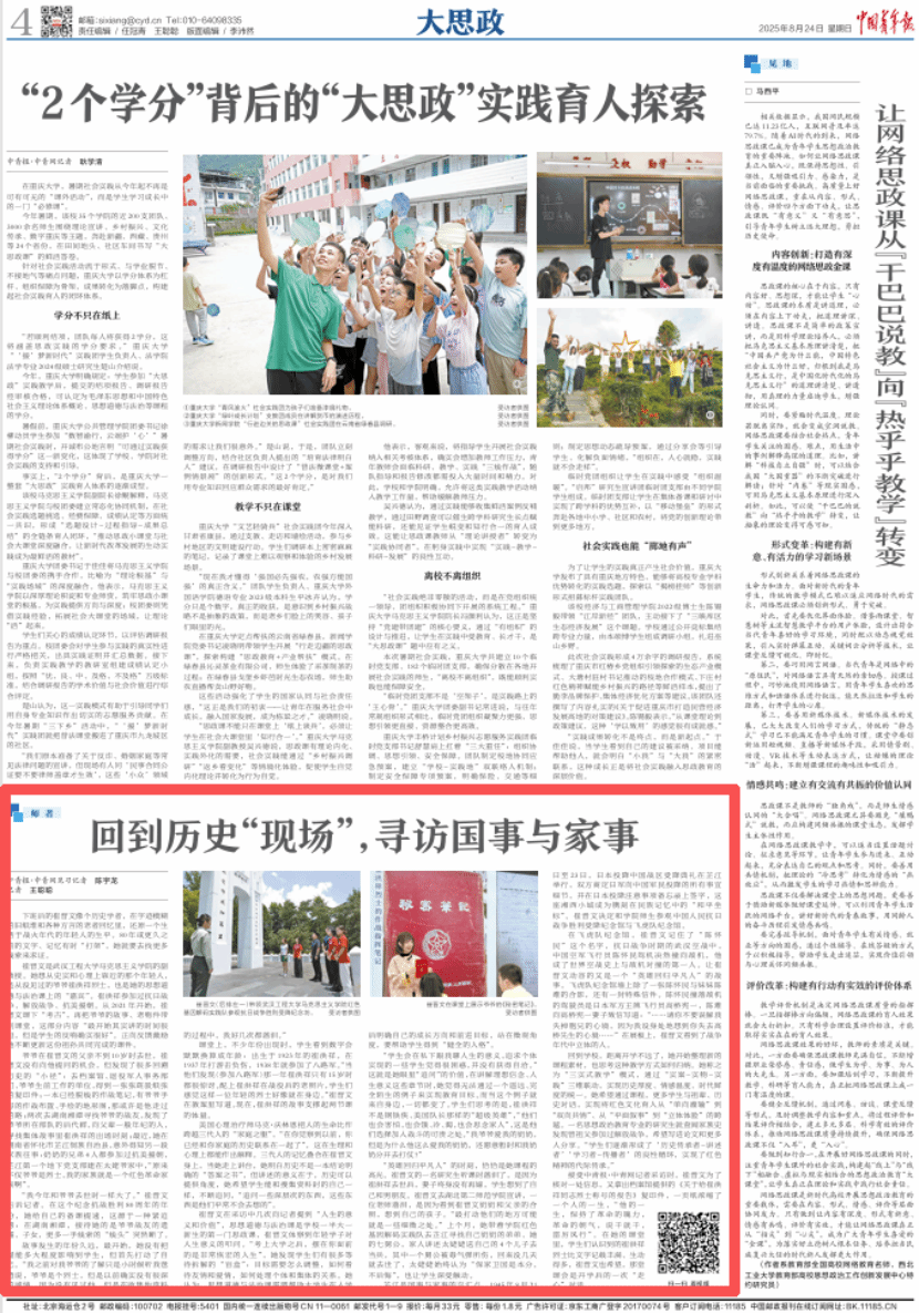 中国青年报思政版头条报道崔晋文讲爷爷的故事