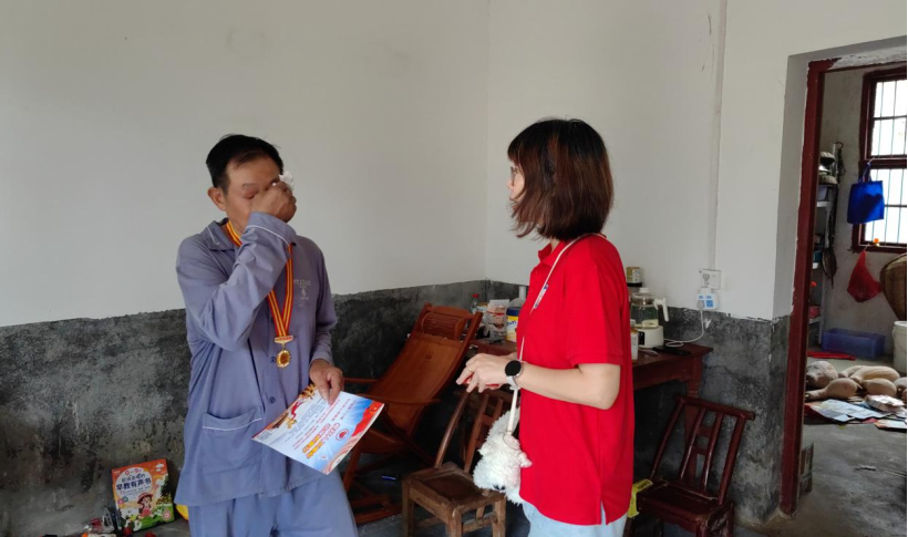 随后,队伍驱车前往通山县慈口乡夏郭畈,探访陈绪安老兵。陈绪安同志在自卫反击战中背负重伤战友坚持步行十几公里脱险,战时三等功、嘉奖6次,今年不幸患上肠癌。