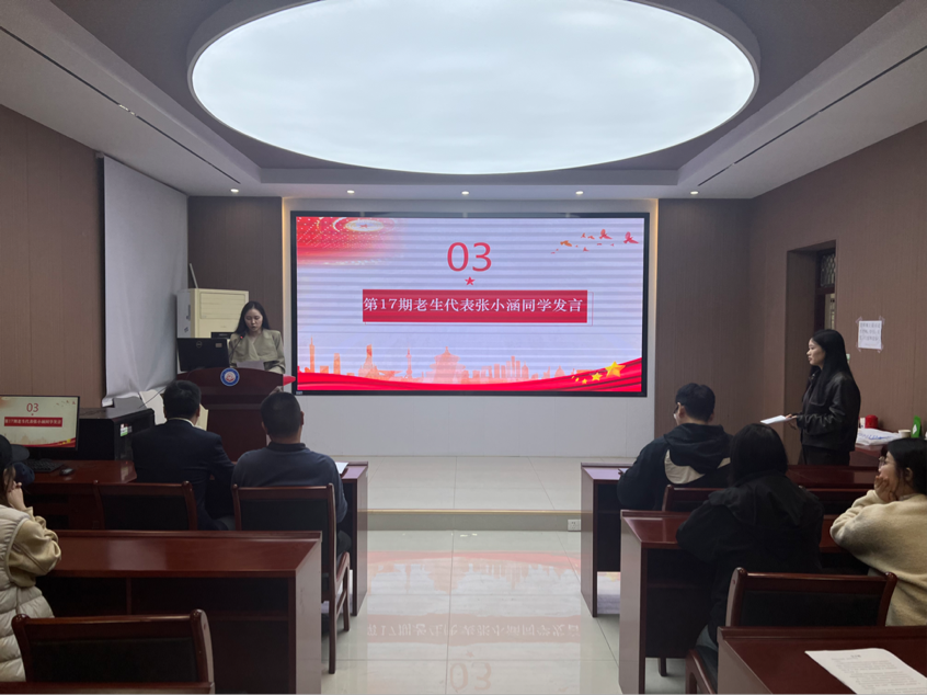 典礼第三项,第17期老生代表张小涵同学发言。她指出,每一次的培训都是思想与实践的碰撞,要筑牢思想之基激励我们前进,同时将理论学习转化为分析解决实际问题的能力,希望大家把个人理想融入党和国家事业之中,在攻坚克难的实际行动中让青春在为祖国为人民的奉献中焕发出绚丽光彩。最后她呼吁各位学员用行动书写坚定党员的信心,筑牢信仰之基,为祖国事业添砖加瓦。