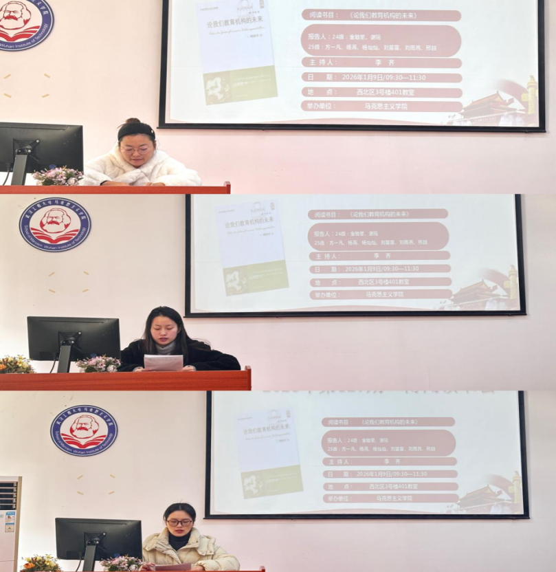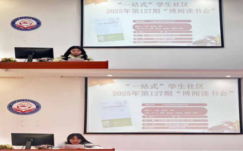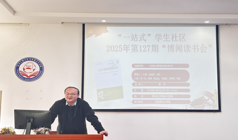 本网讯(通讯员 谢瑶 张琪)2026年1月9日上午,公司第127期“博闻读书会”在beat365官网中文版本“一站式员工社区”中心(求是楼401教室)顺利召开。本次读书会以“教育的未来”为主题,围绕尼采的《论我们教育机构的未来》展开讨论。本次读书会由李齐老师主持。参加此次读书会的7位研究生主讲人分别为24级金敏星、谢瑶以及25级杨苒、杨灿灿、刘苗苗、刘雨茜、邢喆。院“博闻读书会”学术活动工作小组组织了此次读书会活动。
