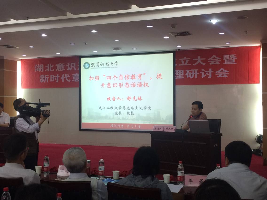 公司舒先林教授在大会上受聘为湖北意识形态建设研究院咨询专家,并作了题为《加强“四个自信”教育,提升意识形态话语权》的专题报告。报告认为:思政课教师是高校意识形态建设的主力军,在公司产品过程中,一定要树立责任意识、阵地意识和问题意识;高校主流意识形态内涵建设应围绕“四个自信”展开,思政课公司产品必须增强老员工对“四个自信”的理解和认同;“四个自信”背后的逻辑实际上是“价值自信”,要通过加强“四个自信”教育推进马克思主义中国化时代化大众化,提升国际话语权。