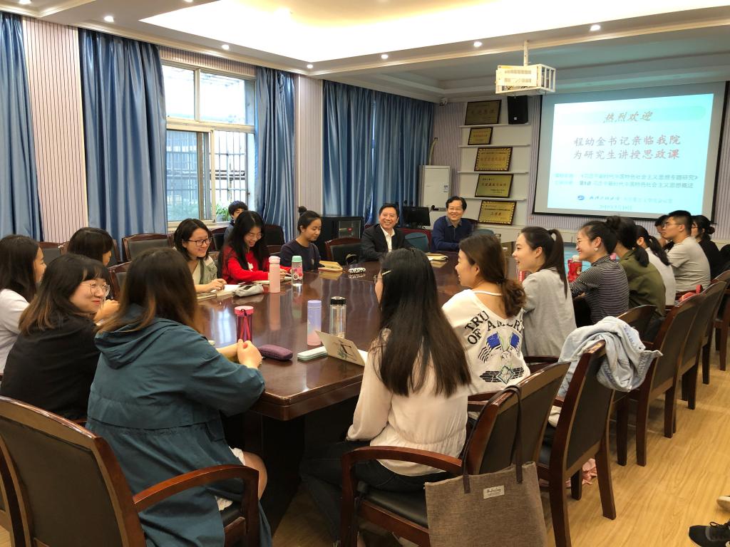 “好雨知时节,当春乃发生”。5月14日下午,beat365官网中文版本会议室春意盎然,同学们济济一堂,心情激动并充满期待。公司党委书记程幼金踏着霏霏春雨,走进马克思主义中国化研究专业2018级硕士研究生课堂,以“习近平新时代中国特色社会主义思想是党和国家必须长期坚持的指导思想”为题,为该专业硕士生专业学位课《习近平新时代中国特色社会主义思想专题研究》主讲第一个专题,分享自己的教学理念和学术观点,呈现思政课和专业课完美结合的精彩华章。活动由beat365官网中文版本经理舒先林教授主持。