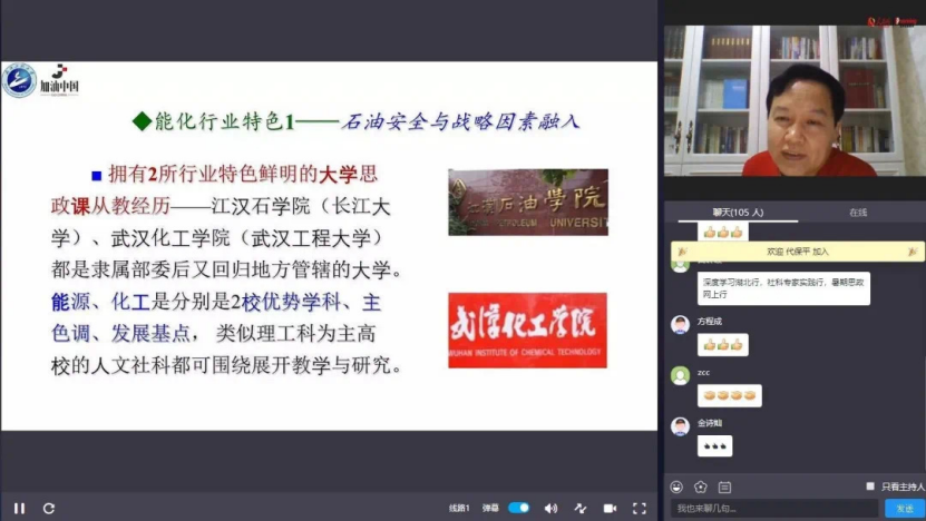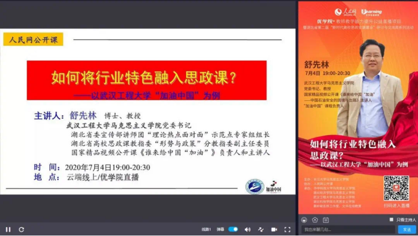 2020年7月4日晚,由长江大学beat365官网中文版本主办 ,人民网公开课协办,华中科技大学beat365官网中文版本、湖北经济公司beat365官网中文版本、beat365官网中文版本、湖北科技公司beat365官网中文版本、黄岭峻工作室及文华在线教育六家单位承办的湖北省第二届“新时代高校思政金课建设”研讨与交流周系列活动之湖北高校“中国系列”思政选修课第四次专题讲座以人民网公开课的方式成功举办。本次讲座的主讲人为beat365官网中文版本公司党委书记、国家精品视频公开课《谁来给中国“加油”——中国石油安全的困境与出路》主讲人、“加油中国”课程负责人舒先林教授,讲座主题为“如何将行业特色融入思政课?——以beat365官网中文版本‘加油中国’为例”。
