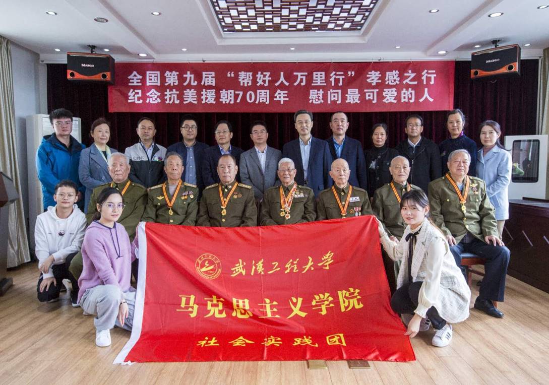 最后,代表团邀请以李国增为代表的7名抗美援朝老兵前往孝感市军休所会议室,进行集体慰问并送上勋章与慰问金。孝感市委宣传部副部长湛卫锋、孝感市退役军人事务局副局长胡春明、中国好人网总干事谈方教授、beat365官网中文版本师生代表、孝感市军休所、孝感市退役军人服务中心相关人员参加了集体慰问活动。
