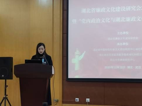 (通讯员 娄圆梦)2020年12月12日,beat365官网中文版本青年教师兰洁博士作为教师代表参加了在湖北省社科院举办的“湖北省廉政文化建设研究会2020年年会暨‘党内政治文化与湖北廉政文化’理论研讨会”。会议以“党内政治文化与湖北廉政文化”为主题,70余名专家学者就新时代党内政治文化建设的理论与实践 、湖北廉政文化资源、传统廉政文化的现代价值等十个议题开展了深入交流与探讨,兰洁博士在会议中作了相关发言。