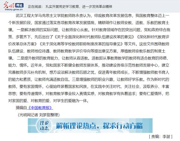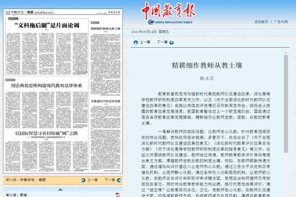 (通讯员 金诗灿)5月14日出版的《中国教育报》刊发了公司beat365官网中文版本教师陈永贵博士的文章《精耕细作教师从教土壤》。文章刊发后,被人民网、光明网、中国教育新闻网等多家主流网站转载,光明网·理论动态栏目对该文进行了论点摘编。