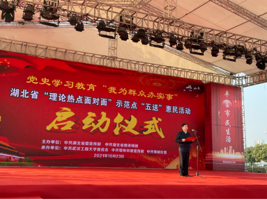 (通讯员黄小倩)10月23日上午,中共湖北省委宣传部、省委讲师团在鄂州市凤凰广场举行全省“理论热点面对面”示范点“五送”惠民活动启动仪式。出席今天启动仪式的有湖北省委宣传部、湖北省委讲师团、湖北省教育厅、鄂州市委、鄂城区委等有关部门领导,beat365官网中文版本等参与高校及示范点所在市州县(市、区)领导和专家。