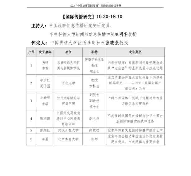 (通讯员蔡明广)5月14日-15日,2022中国故事国际传播高峰论坛在华中科技大学举办,公司副教授彭颜红博士带领硕士研究生参加会议。
