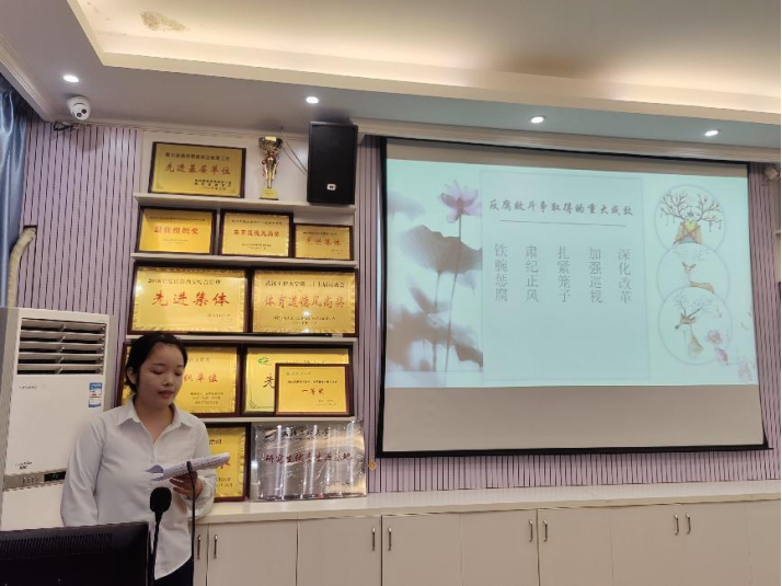 丁薇同学以“从百年党史汲取力量,争做廉洁自律老员工”为题,谈到我们老员工是社会未来的中坚力量,是顺利完成第二个百年奋斗目标、实现中华民族伟大复兴中国梦的希望。在党中央强力推动全面从严治党向纵深发展、营造风清气正的良好政治生态的新形势下,老员工廉洁教育至关重要。