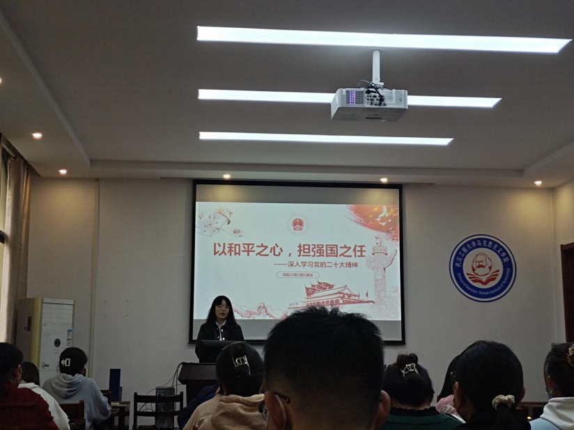 班会分为四项议程进行,首先2022级研究生1班班长仇裴如以“以和平之心,担强国之任”为题,讲述了中国用实际行动维护世界和平、推动构建人类命运共同体、促进世界和平与发展的故事。