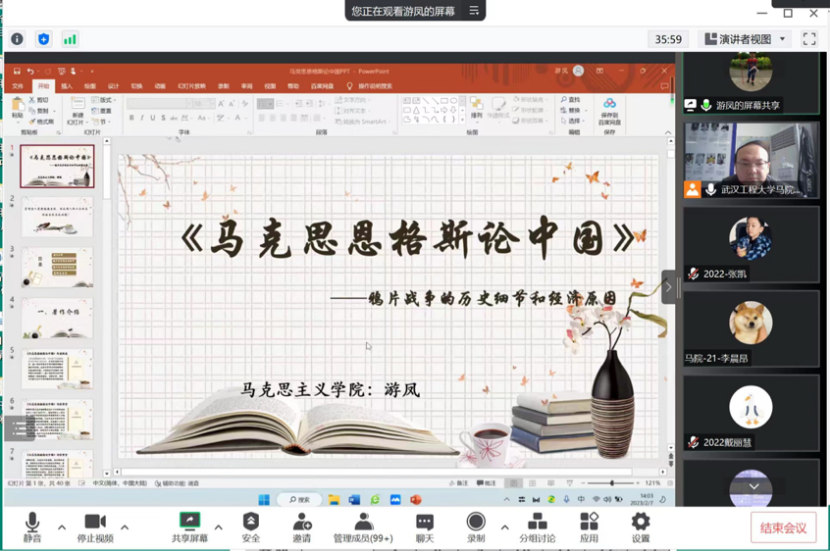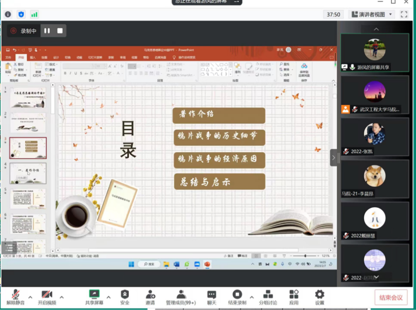 (通讯员:张悦)2023年2月7日下午两点,beat365官网中文版本举办的寒假“精讲精学精练”学术活动第三讲在腾讯会议顺利开讲,本次活动以“《马克思恩格斯论中国》——全球视野下鸦片战争的历史细节和经济原因”为主题,由公司游凤博士主讲,李齐老师主持,20级、21级、22级全体研究生参加了本次学术活动。