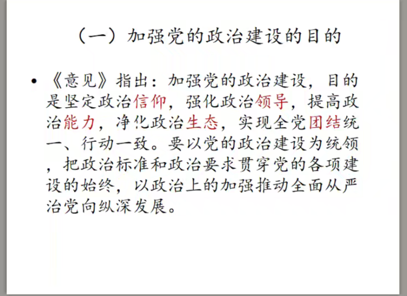 首先,在加强党的政治建设方面,彭颜红教授选择了《中共中央关于加强党的政治建设的意见》的部分内容,介绍了党和国家注重加强党的政治建设的目的,表明党的政治建设具有政治性、系统性、统领性和针对性的特点,从而突出政治属性是政党第一位的属性,表明党的政治建设的极端重要性。