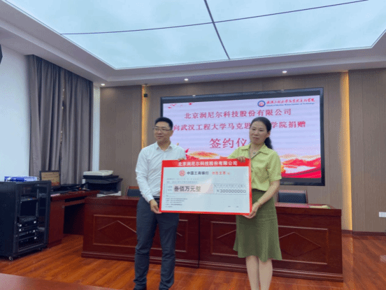 基金会副秘书长毕灵敏代表公司教育发展基金会接受北京润尼尔科技股份有限公司捐赠的支票。