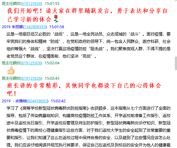 2019级班主任颜欣:大家的学习心得都非常精彩!有态度、有高度、有深度、更有温度!新冠疫情发生以来,习近平总书记在不同场合作出了重要指示,为我们打赢疫情防控阻击战提供了方向和根本遵循。中华民族自古以来就有同舟共济的优良传统,从1998年的抗洪抢险到2008年的汶川地震,再到现在的新冠肺炎疫情,中华民族始终万众一心、众志成城、守望相助。我们党员要继续增强“四个意识”、坚定“四个自信”、做到“两个维护”,不忘初心、牢记使命,切实把思想和行动统一到总书记重要指示精神上来。习近平总书记关于疫情防控工作的系列讲话精神给武汉人民、湖北人民、全国人民以巨大的激励和鼓舞,也为世界抗疫工作提供了中国智慧和中国经验。在这万物复苏的春天,武汉的抗疫斗争取得了突破性的进展,胜利的曙光就在眼前!为确保来之不易的成果,我们还有很多工作去做,比如:我们在长时间内要养成良好的卫生习惯和防范意识,没事不要去人多的地方扎堆,勤洗手,做好高等公司新型冠状病毒肺炎防控工作,全力配合国家打好疫情狙击战!