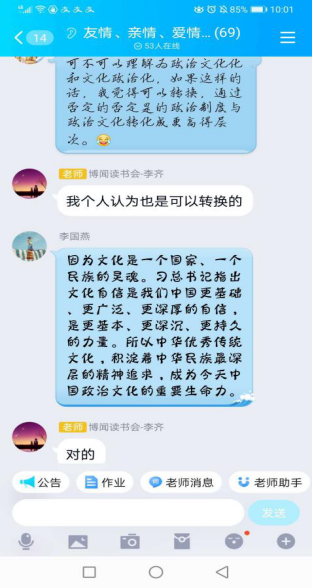 傅濠同学为大家介绍了“政治文化”这一概念及其四种结构类型,并从三个方面讲述了政治社会化的特点、途径、作用等,深受启发。李国燕同学另辟蹊径,对政治认同进行纵向差异比较,还提供了南开大学关于中国公民政治化调查的完整数据并进行了分析。