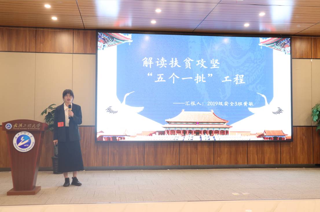 获得二等奖的第三组选手是来自资源与安全工程公司的黄敏,她演讲的主题是“解读脱贫攻坚“五个一批”工程”。她指出,五个一批工程基本涵盖了各类贫困人口,是党对于贫困人口绝不落下一户的坚定承诺,是党在实践中总结出来的生动经验。