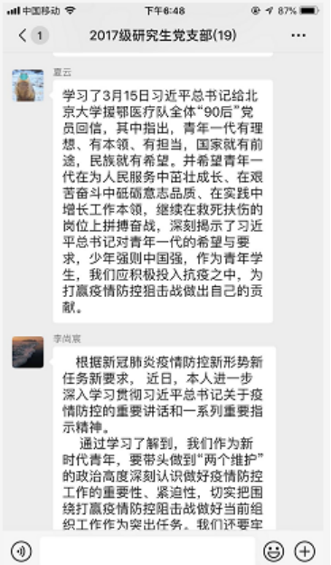 2017级研究生党支部预备党员王慧同志:通过这次突发疫情事件,我充分体会到了社会主义制度的优越性,集中力量办大事,若是没有国家兜底,多少普通家庭将面临崩溃,在经济和百姓性命的选择上,我们国家毫不犹豫选择是的是百姓。我们党在内忧外患中诞生,在磨难挫折中成长,在攻坚克难中壮大。敢于斗争、敢于胜利,是中国共产党人鲜明的政治品格,也是我们的政治优势。