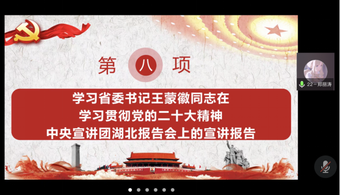 郑丽涛同志领学了省委书记王蒙徽同志在学习贯彻党的二十大精神中央宣讲团湖北报告会上的宣讲报告,她提到王蒙徽书记从七个深刻领会对党的二十大精神进行了全面深入的宣讲解读。王蒙徽书记要求要深刻领会大会主题和主要成果,全省各级党组织和党员领导干部要牢记“三个务必”,永葆“赶考”的清醒和坚定。