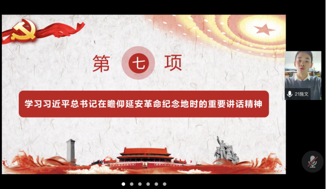 第六项,支部学习交流发言。施文同志领学了习近平总书记在瞻仰延安革命纪念地时的重要讲话精神,他提到习近平总书记强调要弘扬伟大建党精神,弘扬延安精神,坚定历史自信,增强历史主动,发扬斗争精神,为实现党的二十大提出的目标任务而团结奋斗。