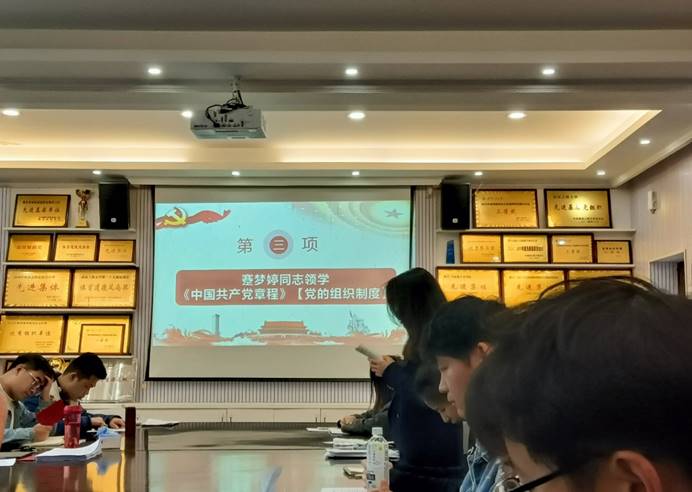 第三项,由蹇梦婷同志领学新党章第二章《党的组织制度》。她分别从党的民主集中制的基本原则、党的各级代表大会的代表和委员的产生方式、党组织的成立和撤销办法等方面进行领学。