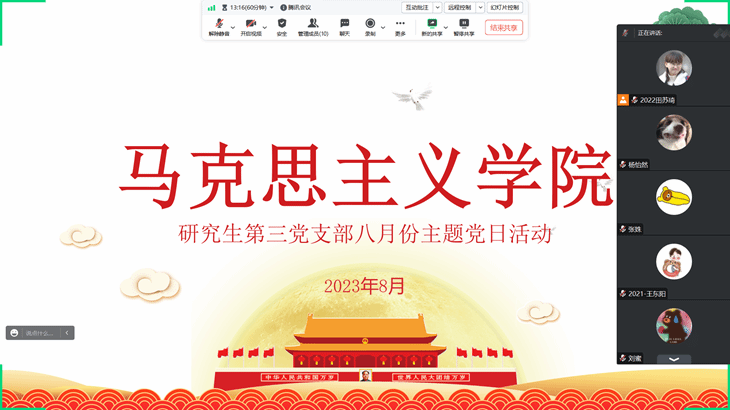 (通讯员 王萍 田苏琦)2023年8月29日晚上19:30,beat365官网中文版本研究生第三党支部通过腾讯会议开展了八月份的主题党日活动。会议由党支部副书记田苏琦主持,研究生第三党支部全体员工党员参加。